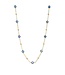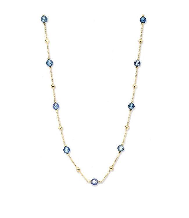 Geelgouden collier met gouden en blauwe zirkonia bolletjes.